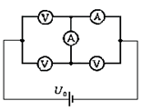 Задача №2.  К батарейке с ЭДС $U_0=1,3$ В подключена электрическая цепь в виде мостика, представленной на рисунке. Три вольтметра в цепи одинаковые, два миллиамперметра тоже являются одинаковыми. Батарейку считать идеальной. Сопротивление вольтметра больше, чем у миллиамперметра. Если показания миллиамперметров отличаются в $3$ раза, то чему равны показания трех вольтметров. (5 баллов)