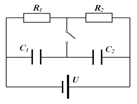Задача №2. В электрической схеме, показанной на рисунке в начальный момент времени ключ разомкнут. Найдите какой заряд пройдет через ключ, если его замкнуть. Емкости конденсаторов $C_1$ и $C_2$, сопротивления $R_1$ и $R_2$, а также напряжения источника U считайте известными. Внутреннее сопротивление источника равно нулю. (5 баллов)
