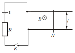Задача №3.  На двух длинных, гладких, параллельных, горизонтальных и проводящих штангах лежит проводящая перемычка $\Pi$ массой $M$ (рисунок 1). Расстояние между штангами $l$. Через резистор сопротивлением $R$ и разомкнутый ключ $K$ к штангам подключена батарея с постоянной ЭДС. Штанги расположены в области однородного магнитного поля с индукцией, равной $B$ и направленной от нас перпендикулярно плоскости рисунка. После замыкания ключа в установившемся режиме перемычка достигает скорости $\vartheta_0$. Пренебрегая внутренним сопротивлением батареи и сопротивлением штанг и перемычки, определите ускорение перемычки сразу после замыкания ключа. (9 баллов)