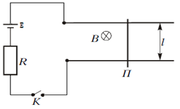Задача №2. На двух длинных, гладких, параллельных, горизонтальных и проводящих штангах лежит проводящая перемычка $\Pi$ массой $M$ (рисунок 1). Расстояние между штангами $l$. Через резистор сопротивлением $R$ и разомкнутый ключ $K$ к штангам подключена батарея с постоянной ЭДС. Штанги расположены в области однородного магнитного поля с индукцией, равной $B$ и направленной от нас перпендикулярно плоскости рисунка. После замыкания ключа в установившемся режиме перемычка достигает скорости $\vartheta_0$. Пренебрегая внутренним сопротивлением батареи и сопротивлением штанг и перемычки, определите ускорение перемычки сразу после замыкания ключа. (8 баллов)