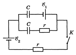 г) количество теплоты $Q$, выделившееся на резисторах после замыкания ключа $K$. (9 баллов)