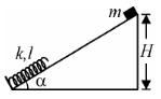 Задача №1. [7 баллов]. На высоте $H$ наклонной плоскости с углом наклона к горизонтали $\alpha$ удерживают брусок массой $m$. Легкая пружина жесткостью $k$ и длиной $l$ укреплена к выступу у основания плоскости и расположена вдоль наклонной плоскости (смотрите рисунок). После того как брусок отпускают с начальной скоростью $\vartheta_0=0$, он соскальзывает и ударяется о пружину. Найти максимальное сжатие пружины. Коэффициент трения между наклонной плоскостью и бруском $\mu$. Ускорение свободного падения $g$.