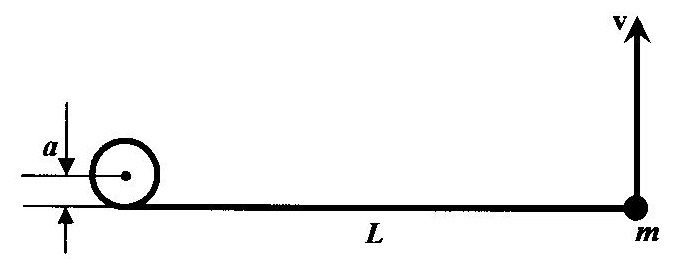 Тело массой $m$ прикреплено к одному концу резинки, а ее второй конец зафиксирован. Коэффициент упругости резинки равен $k$. Начальные условия таковы, что тело движется по окружности радиусом $L$. В какой-то момент времени цилиндр радиуса $a$ $(\ll l)$ устанавливается рядом с центром окружности, как показано на рисунке. С этого момента времени резинка начинает наматываться на цилиндр. Предполагая, что цилиндр является липким, сколько времени потребуется телу, чтобы достигнуть цилиндра?