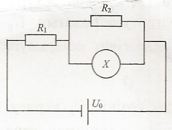 Собрана электрическая схема, показанная на рисунке. Она содержит два постоянных резистора $R_1=3$ Ом и $R_2=1.5$ Ом, а также некоторый съемный элемент $X$, на место которого можно вставлять различные приборы. Вся схема подключена к источнику постоянного напряжения $U_0$, которое можно изменять, а его внутреннее сопротивление пренебрежимо мало.