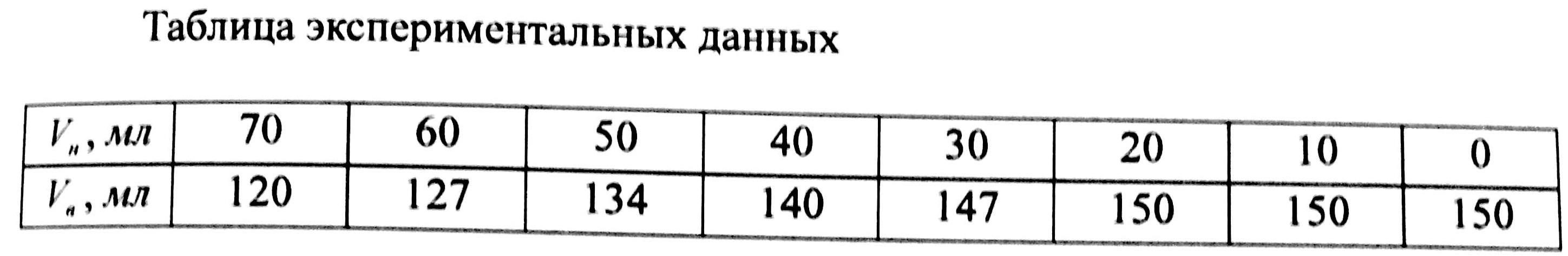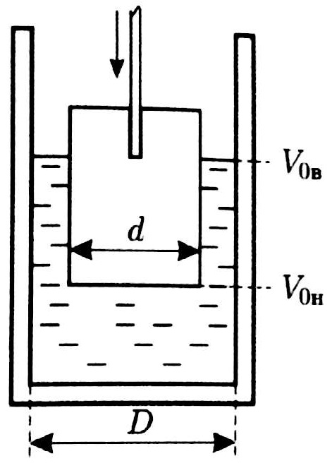 Деревянный цилиндр диаметром $d$ плавает в мерном стакане, внутренний диаметр которого равен $D$. При этом нижний край цилиндра находится на уровне отметки $V_{OH}=70$ мл, нанесенной на шкале мерного стакана, а уровень воды в стакане соответствует объему $V_{OB}=120$ мл. Цилиндр плавно погружают в воду очень тонкой спицей так, что его ось все время остается вертикальной. При этом измеряют уровень воды $V_{b}$ в мерном стакане и положение $V_{H}$ нижнего края цилиндра по шкале, нанесенной на мерном стакане.