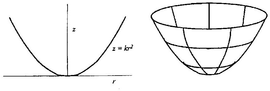 Тело может двигаться по внутренней поверхности параболоида вращения, сечение которого имеет уравнение $z=kr^2$. Тело, находящееся на высоте $z_0$ от вершины, начинает двигаться вдоль поверхности с горизонтальной скоростью $\vartheta_0$. Ускорение свободного падения равно $g$, геометрические размеры тела очень малы.
