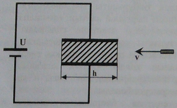 Часть Б (5.0 балла) В плоский прямоугольный конденсатор емкости $C$ вставлена диэлектрическая пластина с проницаемостью $\varepsilon$ и массой $M$, которая может скользить по пластинам без трения. Конденсатор подключен к источнику постоянного напряжения $U$. В какой-то момент времени в диэлектрик попадает пуля массы $m$ и застревает в нем. Длина пластин конденсатора в направлении движения пули равна $h$, а размерами самой пули можно пренебречь.