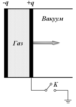Цилиндрлік ыдыстың қабырғалары өткізбейтін материалдан, ал түбі мен қозғалмалы поршень өткізгіштен жасалып, олар көлденең қимасының ауданы $S=100$ см$^2$ болатын жазық конденсаторды құрайды. Түбі мен поршеннің арасында бастапқы температурасы $T_0=100$ К және массасы $m=1$ г болатын біратомды газ орналасқан. Түбі мен поршеннің арасындағы бастапқы арақашықтық $x_0=5$ мм, поршень мен түбінің бастапқы зарядтары $\pm q=85,7$ мкКл, қозғалмалы поршеннің массасы $M=1$ кг, универсал газ тұрақтысының мәні — $R=8,31$ Дж/(моль$\cdot$К). Ыдыс қоршаған ортадан оқшауланған, ал оның жылусыйымдылығын ескермеуге болады. Қозғалмалы поршенді $K$ кілт арқылы жермен қоса отырып, оның зарядын өзгертуге болады. Уақыттың бастапқы мезетінде $K$ кілт ажыратылған болсын.
