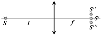 Бөлім 1С (3,5 ұпай) Жинағыш линза, өзінен $f$ қашықтықта орналасқан $S'$ нүктесінде, бас оптикалық осте өзінен $l$ қашықтықта орналасқан $S$ нүктелік көздің кескінін береді. Линза диаметрі бойымен шатынаған, оның сынығын тегістеп, желімдеген соң, ол оске қатысты, арақашықтығы $a$ болатын $S''$ және $S'''$ екі симметриялық кескін беретін болған. Тегістеу кезінде алынып тасталған қабаттың қалыңдығын табыңыз.