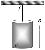 6. где $e$ — элементарный заряд, а $m$ — масса электрона. Найдите $g$; Рассмотрим известное явление, которое было предсказано О. Ричардсоном в 1908 году, и теоретически объясненное Эйнштейном и де Хаазом в 1915 году. Из магнетика с магнитной проницаемостью $\mu$ изготовлен длинный цилиндр, имеющий радиус $R$, длину $L\gg R$ и массу $M$. Цилиндр подвесили на упругой нити, при закручивании которой на угол $\alpha$ на него действует момент сил $$M=f\alpha,$$ где $f$ — так называемый модуль кручения нити. Цилиндр помещается во внешнее магнитное поле с индукцией $B$, параллельной его оси.