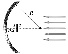 Часть 1С (3,5 балла) На сферическое зеркало радиусом $R$ параллельно ее оптической оси падает широкий однородный световой пучок. На расстоянии $R/4$ от вершины зеркала перпендикулярно оптической оси расположен небольшой непрозрачный диск радиусом $r$, $r\ll R$. Найдите отношение $(\Delta T_1)/(\Delta T_2)$ разностей температур поверхностей диска ($1$ и $2$) и температуры окружающего воздуха. Теплопроводностью диска пренебречь, а теплообмен каждой его поверхности с окружающей средой пропорционален разности их температур.
