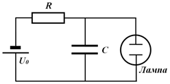 Часть 1B (3,5 балла) Газоразрядная лампа включена в цепь, показанную на рисунке. Сопротивление лампы в погасшем состоянии очень велико (считайте, что равно бесконечности), а если напряжение на ней достигает величины $U=10$ В, то лампа вспыхивает, и ее сопротивление падает практически до нуля. Найдите частоту вспышек лампы. Напряжение источника $U_0=1$ кВ, $R=1$ кОм, $C=100$ мкФ.