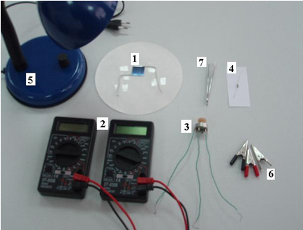Приборы и принадлежности: Солнечный элемент (1), цифровые мультиметры, $2$ штуки (2), резистор с переменным сопротивлением (3), резистор с известным сопротивлением ($1,00\pm 0,01$) Ом (4), электрическая лампа (5), «крокодильчики» (6), пинцет (7), миллиметровая бумага.
