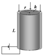Электрический нагреватель воды состоит из двух коаксиальных хорошо проводящих цилиндров длиной $L$. Радиус внутреннего цилиндра равен $r$, расстояние между цилиндрами значительно меньше радиусов цилиндров и равно $h$. Цилиндры подключены к источнику постоянного напряжения $U_0$. Между цилиндрами медленно протекает вода, которая нагревается благодаря протекающему через нее электрическому току. Рассчитайте, с какой скоростью должна течь вода, чтобы ее температура повысилась на $\Delta t$ градусов. Характеристики воды: плотность $\gamma$, удельное электрическое сопротивление $\rho$, удельная теплоемкость $c$. Теплоемкостями цилиндров и потерями теплоты в окружающую среду можно пренебречь.