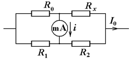 Для измерения электрического сопротивления широко используются мостовые схемы. На рисунке показана электрическая схема моста Уитстона, предназначенная для измерения неизвестного сопротивления $R_{x}$. Сопротивления резисторов $R_1$ и $R_2$ можно плавно изменять. Сопротивление резистора $R_0$ известно с высокой точностью. Изменяя сопротивления $R_1$ и $R_2$, добиваются, чтобы ток $i$ через миллиамперметр стал равным нулю. В этом случае говорят, что мост сбалансирован.