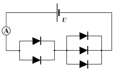 На отдельном бланке приведен график вольтамперной характеристики одного диода (зависимости силы тока через диод от напряжения на нем — $I_0(U)$). Пять таких одинаковых диодов соединены так, как показано на рисунке. Постройте график зависимости силы тока в цепи от напряжения источника $U$, если последнее изменяется от $0$ до $3$ В.