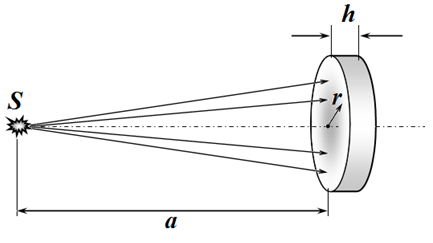 Круглая прозрачная плоскопараллельная пластинка толщиной $h$ изготовлена из мате-риала, оптический показатель преломления которого зависит от расстояния $r$ до централь-ной оси пластинки по закону $$n(r)=n_0(1-\beta r^2),\quad (1)$$ где $n_0$, $\beta$ — известные положительные постоянные величины. Пластинка находится в воздухе, показатель преломления которого $n=1$. На оси пластинки на расстоянии $a(a\gg h)$ расположен точечный источник света $S$. Покажите, что пластинка является своеобразной линзой, то есть, формирует точечное изображение источника. Определите, на каком расстоянии $b$ от пластинки находится изображение источника $S$. Чему равно фокусное расстояние этой линзы?