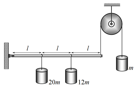 Один конец жёсткого невесомого стержня шарнирно закреплён, к другому концу на перекинутой через невесомый блок нити подвешен груз массой $m$. Ещё два груза массами $20m$ и $12m$ подвешены на нитях к стержню в точках, делящих его на три равные части (см. рис.). Все нити невесомы и нерастяжимы. Стержень удерживают неподвижно в горизонтальном положении, а затем отпускают. Найдите ускорения грузов сразу после отпускания стержня. Ускорение свободного падения равно $g$.
