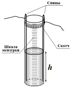 Часть 2. [5 баллов]. Опустите спицы до дна мензурки на максимальном расстоянии друг от друга и параллельно друг другу. Верхние концы спиц загните и закрепите их на верхнем краю мензурки. Дополнительно закрепите их с помощью полоски скотча. Для измерения высоты уровня воды используйте шкалу мензурки. Самостоятельно определите цену деления этой шкалы в миллиметрах.