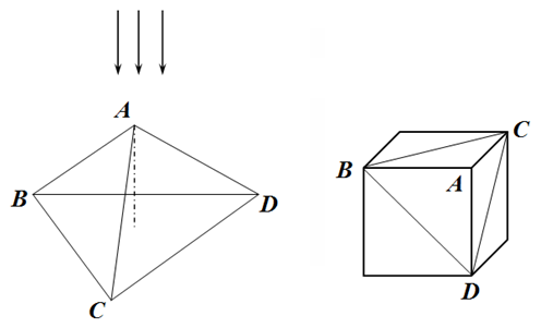 Задача 1.С. Пирамида (3.0 балла) Правильная треугольная пирамида $ABCD$ изготовлена из прозрачного материала с показателем преломления $n=1,6$. Все углы при вершине пирамиды $A$ — прямые. В основании пирамиды лежит правильный треугольник $BCD$, длины сторон которого равны $a=2$ мм. Эту пирамиду также можно представить, как «угол, отрезанный от куба». Пирамида однородно освещается так, что свет падает вдоль ее высоты, перпендикулярно плоскости основания.
