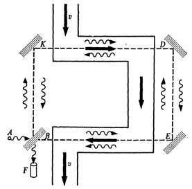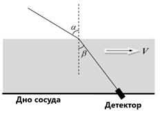 Рассмотрим поток воды, движущийся относительно дна сосуда со скоростью $V$. На поверхность воды падает плоская электромагнитная волна, которая составляет угол $\alpha$ с нормалью в лабораторной системе отсчета. На дне сосуда установлен остронаправленный детектор. Считайте коэффициент преломления воды известным и равным $n$.