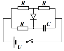 Задача В (4,0 балла). Изображённая на рисунке схема состоит из конденсатора ёмкостью $С = 100$ мкФ, идеального диода, источника постоянного напряжения $U=10$ В, трёх одинаковых резисторов сопротивлением $R=10$ кОм и ключа. В начальный момент конденсатор не заряжен, ключ разомкнут. После замыкания ключа ток через диод идёт в течение времени $\tau=462$ мс, а затем прекращается.
