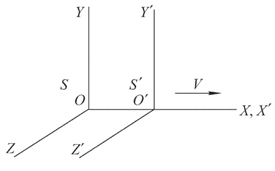 Рассмотрим две инерциальные системы отсчета $S$ и $S'$, из которых вторая движется относительно первой со скоростью $V$ как показано на рисунке. Будем считать, что начала $O$ и $O'$ совпадают в начальный момент времени $t=t'=0$ по часам обеих систем отсчета $S$ и $S'$. Известно, что преобразования Лоренца пространственно-временных координат любого события $(x',y',z',ct')$ в системе $S'$ в пространственно-временные координаты $(x,y,z,ct)$ этого же события в системе $S$ имеют вид $$x=\frac{x'+(V/c)ct'}{\sqrt{1-V^2/c^2}}, y=y', z=z', ct=\frac{ct'+(V/c)x'}{\sqrt{1-V^2/c^2}},$$ где $c=2,9979\cdot 10^8$ м/с — скорость света.