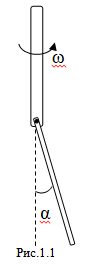 Один из концов однородного массивного стержня длины $L$ шарнирно прикреплен к вертикальной оси. Шарнир устроен так, что в системе отсчета, связанной с осью, стержень может совершать колебания в одной вертикальной плоскости. Трение в шарнире отсутствует. Ось вращается с угловой скоростью $\omega$, ускорение свободного падения — $g$ (Рис.1.1)