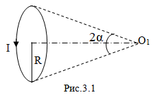 а) Вычислите магнитное поле в точке $O_1$ на оси кольца. Кольцо видно из точки $O_1$ под углом $2\alpha$. (См.Рис.3.1)