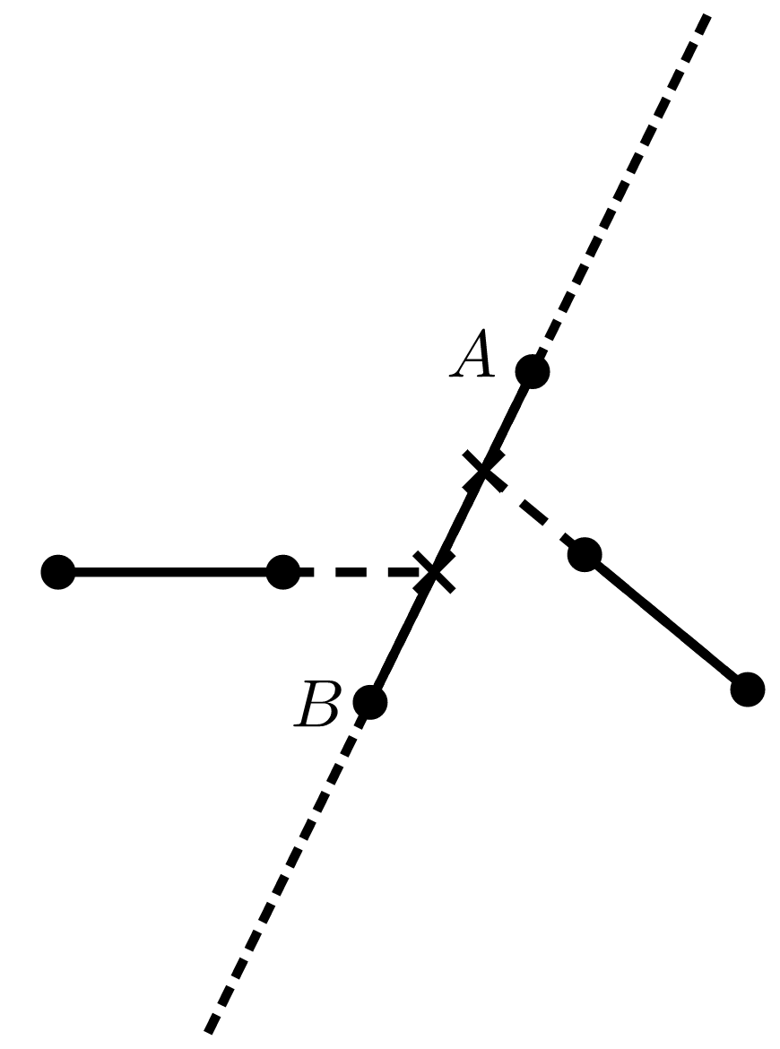 b) Назовем отрезок окружённым, если в каждой полуплоскости относительно него найдётся ровно один отрезок, который его разбивает (например, отрезок $AB$ на рисунке является окружённым). Возможно ли такое расположение отрезков, при котором каждый отрезок окружён?