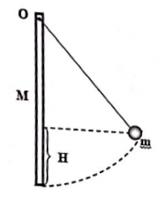 Есеп №2. (7 ұпай). Массасы $m$ математикалық маятник пен массасы $M$ стерженнің ұзындықтары өзара тең. Екеуі де бір $O$ нүктесіне бекітілген, және де осы нүкте маңында еркін тербеле алады (суретті қараңыз). Шарикті бір шетке ауытқыта отырып, $H$ биіктікке көтеріп, маятникті тепе-теңдік күйінен шығарады. Одан кейін шарикті бастапқы жылдамдықсыз босатады, және де ол төменгі күйінде стерженмен соқтығысады. Соқтығысты серпімсіз деп есептеп, соқтығыстан кейін шарик пен стерженнің төменгі ұшы қалай қозғалатындығын, және олар қандай биіктіктерге көтеріле алатындығын анықтаңыз. $O$ нүктесі арқылы өтетін, стержень жазықтығына перпендикуляр оське қатысты стерженнің инерция моменті $I=\frac{Ml^2}{3}$-ке тең.
