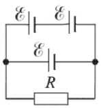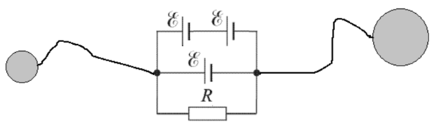 Задача №3. [8 баллов]. Три идентичные батареи с Э.Д.С. $\varepsilon$ соединены друг с другом, как указано на схеме, и нагружены сопротивлением $R$. Внутреннее сопротивление батарей намного меньше $R$. Какой ток протекает через сопротивление нагрузки? Какие заряды появятся на проводящих шарах радиусами $a$ (слева) и $b$ (справа), если их соединить проводами с указанными на рисунке точками цепи? Расстояние между шарами значительно больше их радиусов.